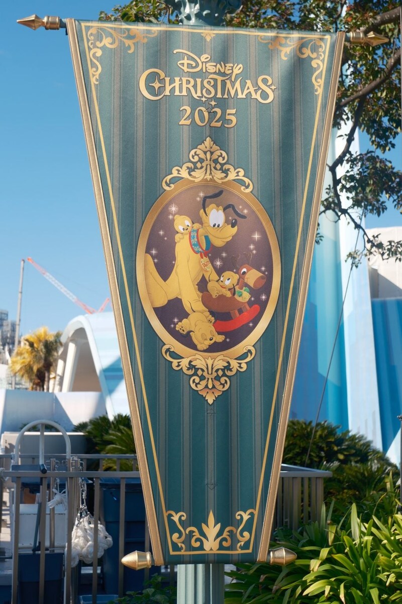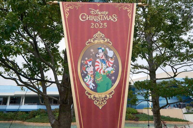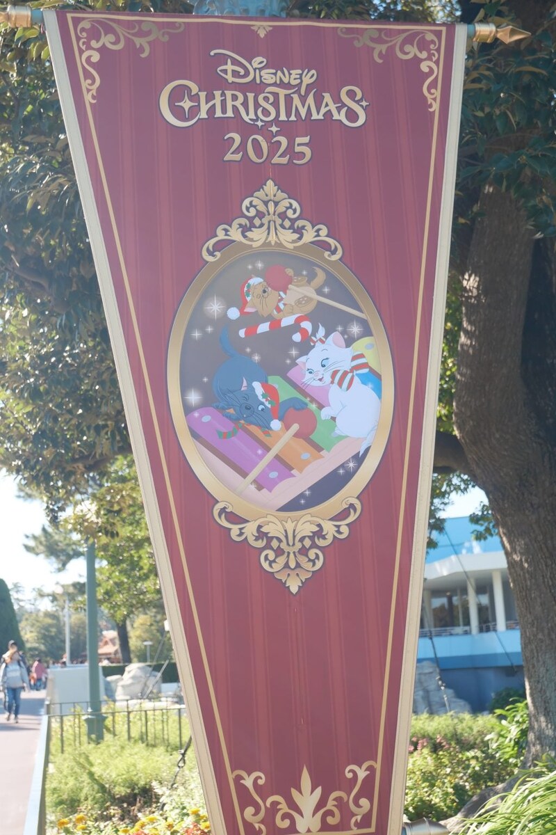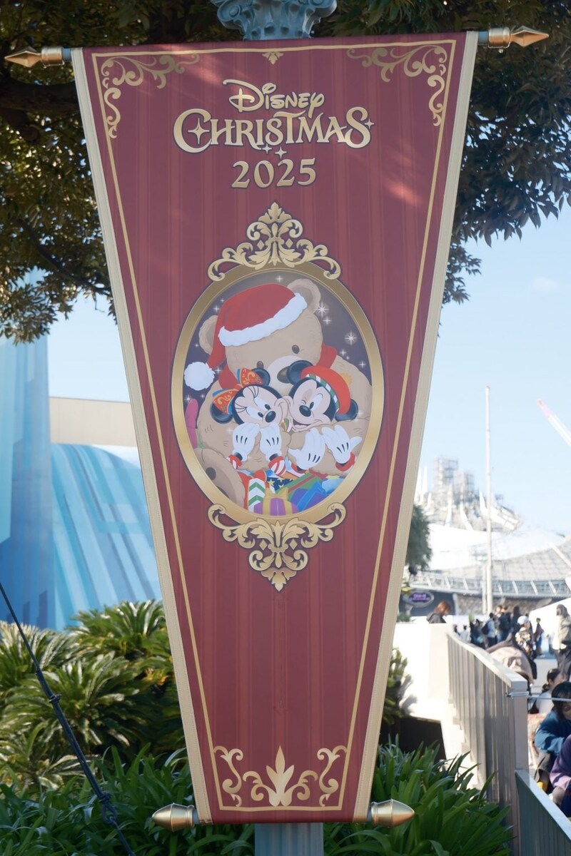 パレードルートには、新パレード「トイズ・ワンダラス・クリスマス!」のデザインのバナーが飾られていて、パレードを観た後だとこのバナーのデザインの良さをより一層感じます!