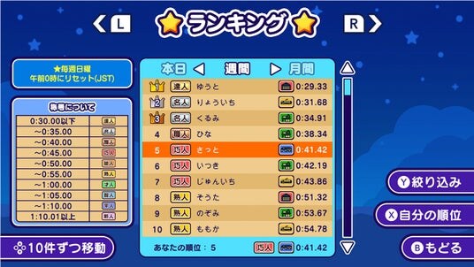 クリアタイムを競い、オンラインランキングの上位を目指すモード。