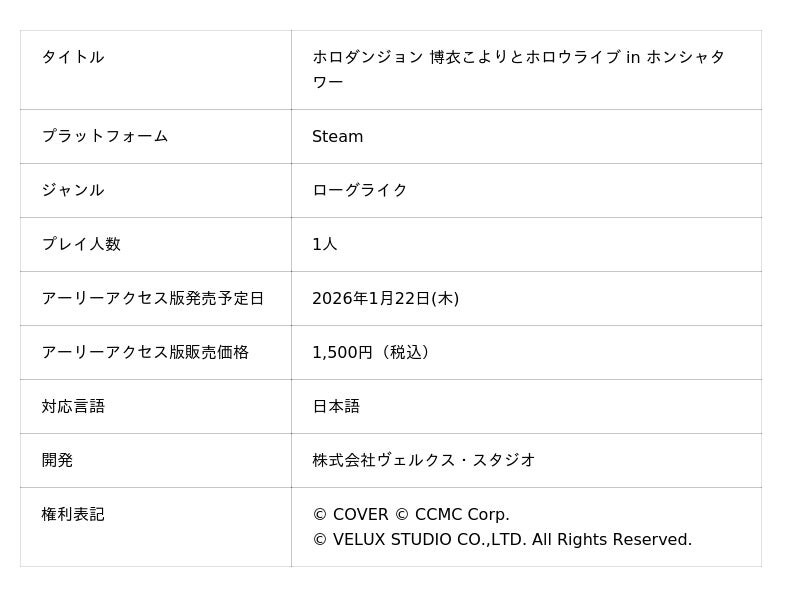株式会社ヴェルクス・スタジオ(本社:東京都渋谷区、代表取締役社長:五十嵐翔、以下「ヴェルクス・スタジオ」)は、女性VTuberグループ「ホロライブ」を題材としたローグライクゲーム『ホロダンジョン 博衣こよりとホロウライブ in ホンシャタワー』(以下ホロダンジョン)を、カバー株式会社(本社:東京都港区、代表取締役社長:谷郷元昭)の子会社である「株式会社シー・シー・エム・シー」(以下”CCMC”)が運営する「holo Indie」よりSteamにてリリースすることをお知らせします。
