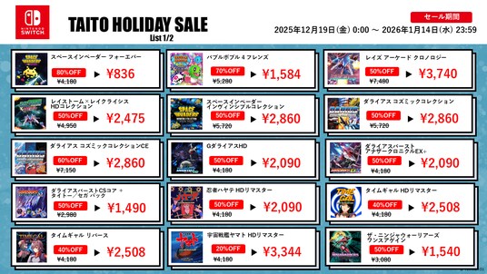 株式会社タイトー(本社:東京都新宿区、以下タイトー)は、対象のNintendo Switch(TM)用ソフト(ダウンロード版)やSteam用ソフトが最大80%オフとなる「タイトーホリデーセール2025」を実施いたします。