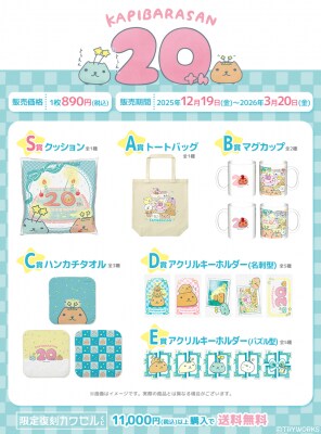 フィジカルグッズのオンラインくじ「カワセルくじ」にて、大好評を博しながらも限定期間での販売を終了した「カピバラさん」の20周年記念くじが、再販を要望するファンの声を受けて、待望の【復刻再販】です。