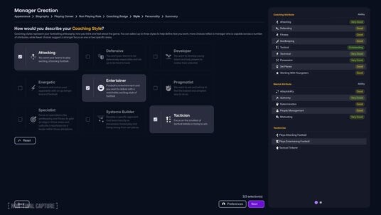さらに、コーチングスタイルや性格を選ぶことで、監督としての理念や指導方針がゲーム内に具体的に反映されます。これらはキャリアの進行によって変化し、経験に応じて“傾向”が身についたり失われたりするなど、長期にわたる成長と変化を感じられる設計になっています。