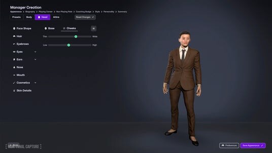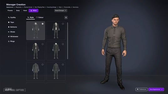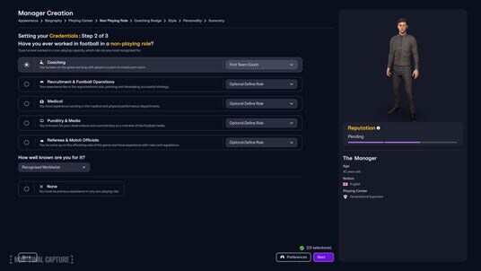 外見のカスタマイズはプリセットの拡充と高精細なビジュアル強化により、髪型、顔の造形、服装の質感などをより細かく調整可能。服装の組み合わせ自由度も高まり、自分だけの監督像を自然な視点で作り込めます。経歴設定では、選手としての実績に加え、新要素としてコーチングやメディカル、審判経験など“プレイヤー以外の経歴”も選択でき、監督としてのバックグラウンドを多面的に構築できます。これらの選択はスタート時の評判や能力値にも影響し、キャリアの方向性を左右します。