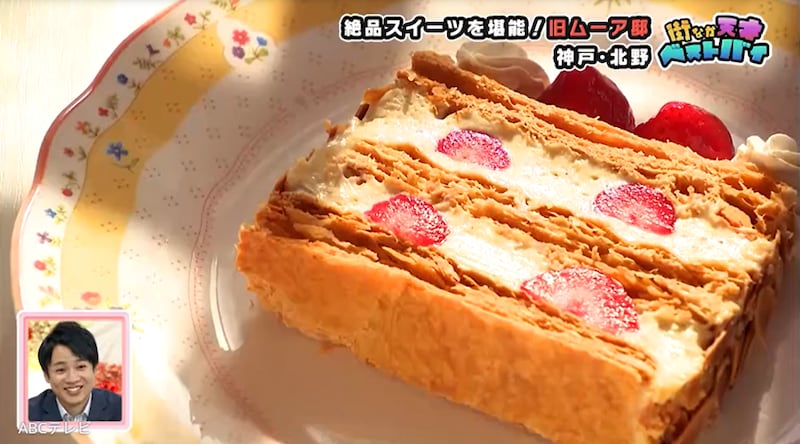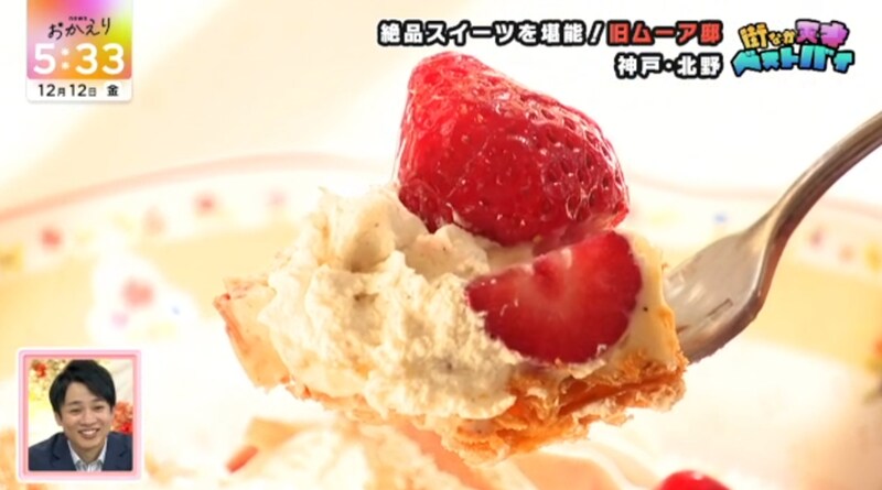 天才ピアニストは、散策中に発見した白亜の洋館・北野異人館 旧ムーア邸で、ミルフィーユとシャンパンのセットを注文し、優雅に休憩することに! ますみは、「なんておいしいんでしょう! このサクサクのパイの中にふんわり香り立つイチゴ。クリームとのマリアージュが最高ね~!」とミルフィーユに感動し、女性パティシエに感謝しました。