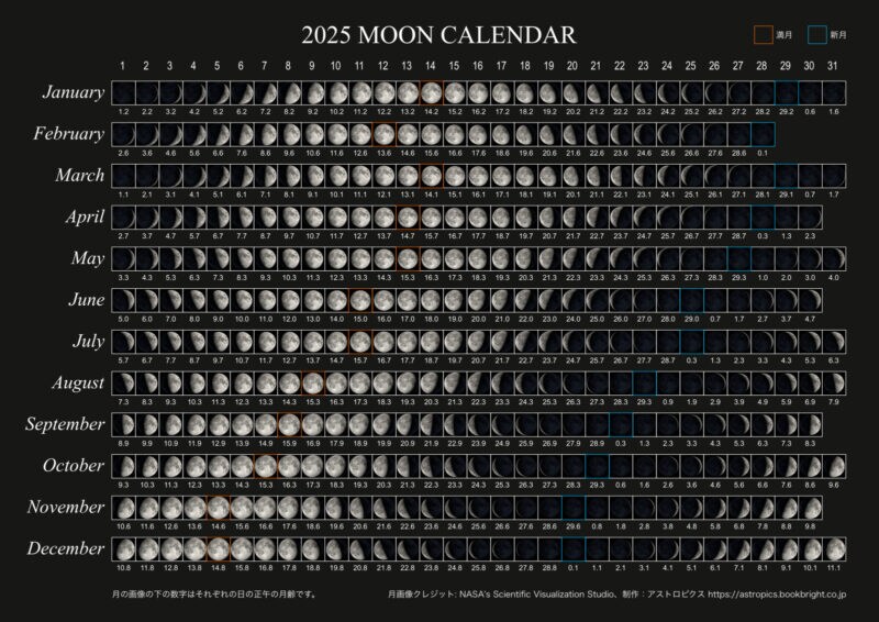 こちらの画像は、アストロピクス編集部で作成した2025年の月の満ち欠けを示したカレンダーです。