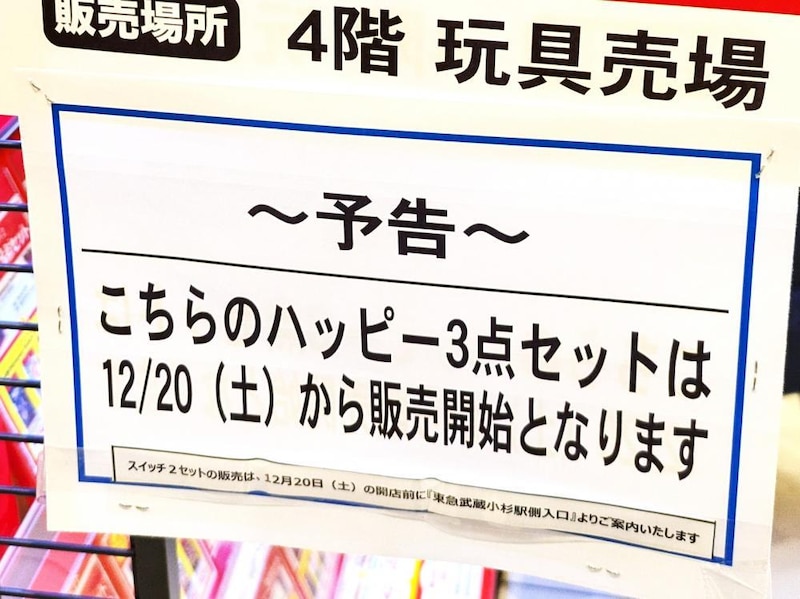 2025年12月20日に、商業施設「グランツリー武蔵小杉/イトーヨーカドー」(神奈川県川崎市中原区新丸子東3丁目1135番地1号)で、「Nintendo Switch 2」を含むセット商品の販売があります。