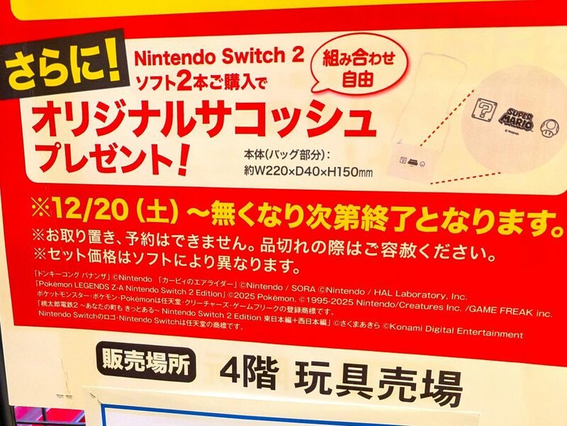 また、Switch 2用ソフトを2本購入すると「オリジナルサコッシュ」がもらえるキャンペーンも実施されます(※ソフトの組み合わせは自由)。