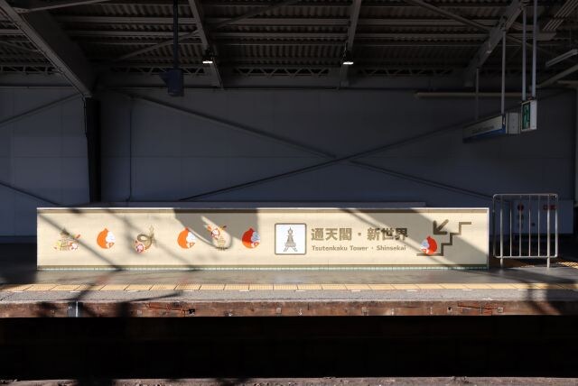 駅構内の装飾をはじめ、ホームから通天閣へ続く出入口通路にはキャラクター「ビリケンだるま」(※)による案内イラストを掲出。通天閣へ迷わず向かえるように案内します。