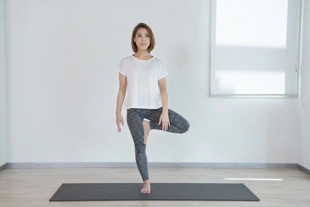 (4)合掌して右脚で立ったまま左の足裏と右の内ももを押し合い、体が上下に伸びるイメージをしながらゆっくり3〜5呼吸(約30秒間)キープする