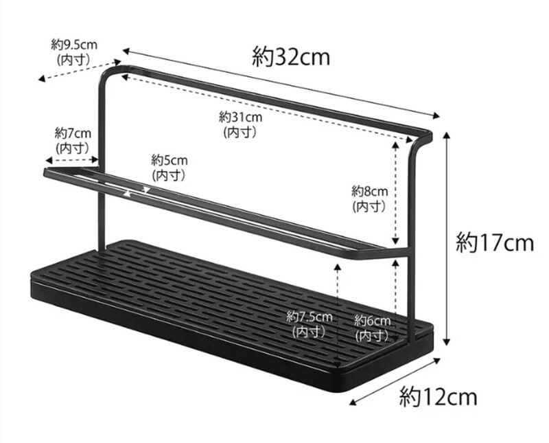 サイズは約W32XD12XH17cm。500mL~2Lのボトルに対応しています。大きな2Lサイズのジャグボトルを2個置くことができるワイドサイズです。