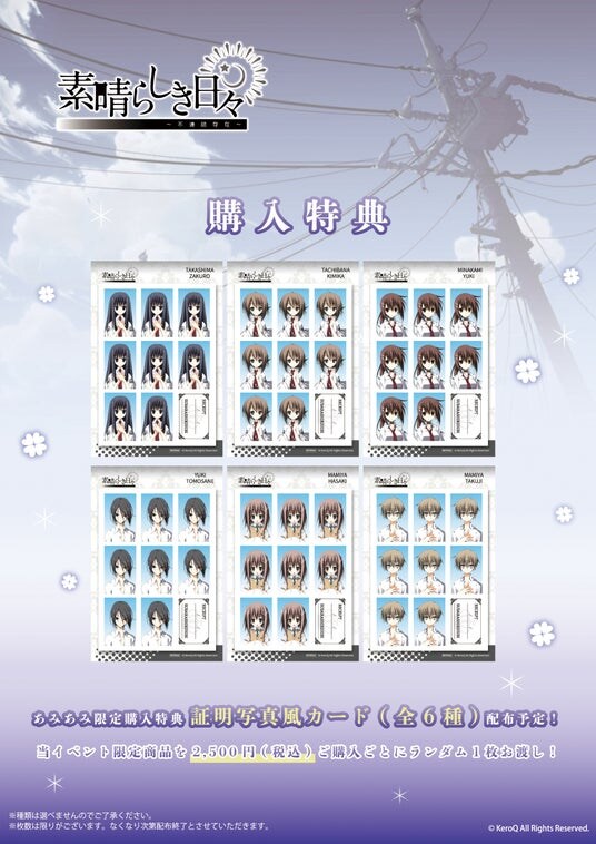 3.本イベント限定商品を1会計2,500円(税込)以上ご購入につき、あみあみ店舗限定購入特典<証明写真風カード(全6種)>をランダムで1枚プレゼント。