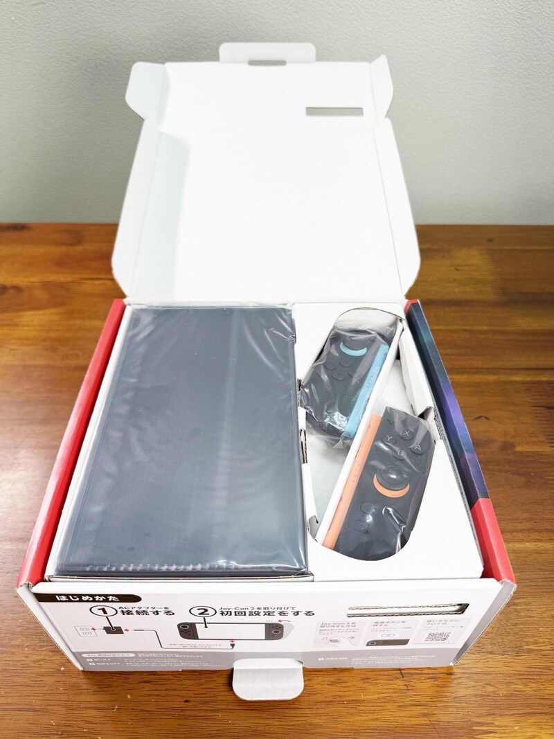 さっそく開封してみると、いつものNintendo Switchよりも明らかに大きなNintendo Switch2が姿を現しました。本体のビジュとしては、見た感じ「日本語・国内専用」と見分けがつきません。箱にはハッキリと「多言語対応」と書かれているのでわかりやすいです。