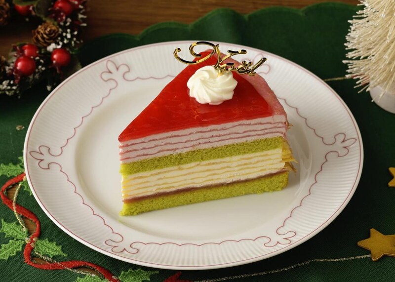苺グラサージュと苺クリームの赤、抹茶スポンジの緑が映える、クリスマスらしい色合いのミルクレープ。カスタード入りクリームを挟んだプレーンなクレープと、苺クリームを重ねた苺風味のクレープを層にし、奥行きある味わいが楽しめます。