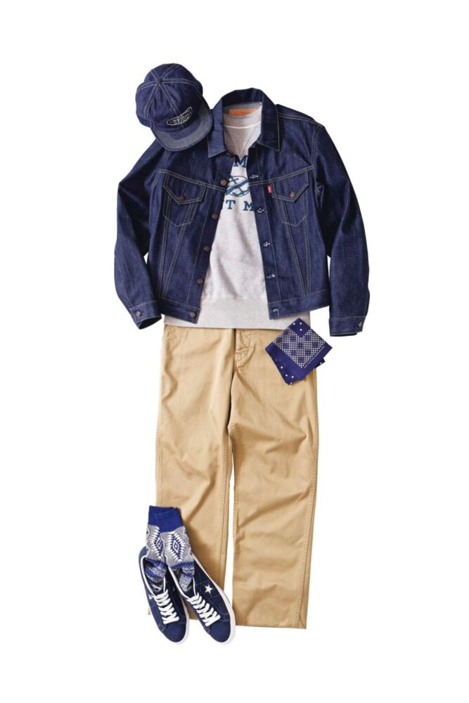 ジージャンにチノを合わせた王道アメカジ。ブルー多めで色数を抑えれば、スウェットや小物も自然に馴染み、ベーシックなスタイルに。そこに赤い小物を散らすと、一気にポップな雰囲気になる。インナーやソックスでチラ見せするだけでも“こなれ感”が出て楽しいし、キャップをニット帽に替えるのも効果的。さらにスウェットをオートミールにすれば赤が映え、王道なのに遊び心あるスタイルへアップデートできる。