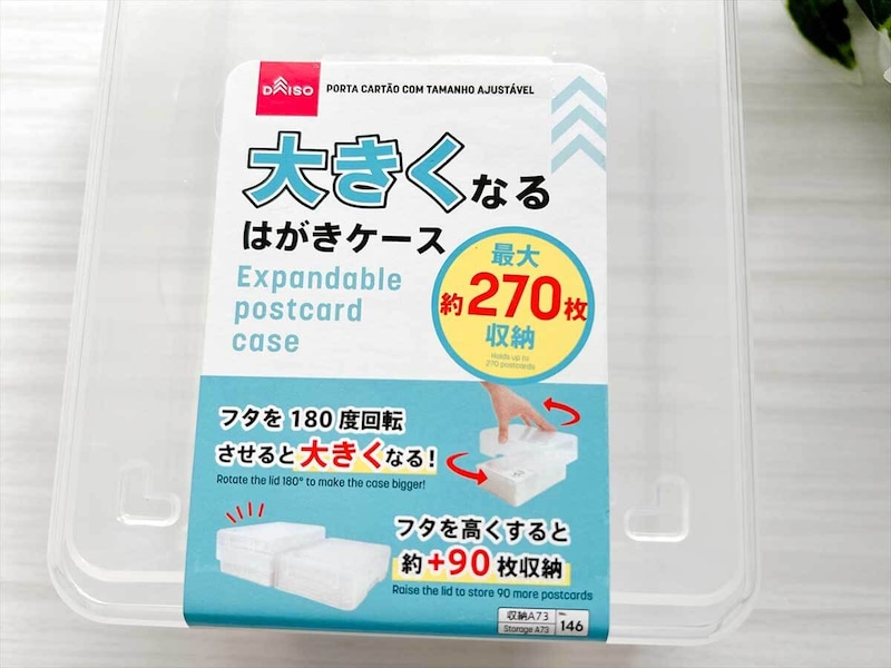 ダイソーで話題の「大きくなるはがきケース」(110円)は、はがき収納に便利なPP製ケース。