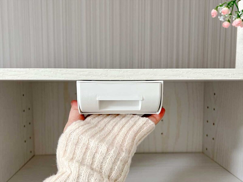 PCデスクやカラーBOXの隙間に粘着タイプで取り付け可能なショート(幅9.3×高さ4×奥行12.5cm)とロングサイズ(幅12.4×高さ4×奥行25cm)の2種類があり、棚板サイズを選ばず設置OK。500gまでの収納に対応し、引き出し落下防止用ストッパーも搭載。カラーBOXやローテーブル、ダイニングテーブルに追加の引き出しを取り付けられます。「こんなの欲しかった!」の声続出で、リピート購入&売り切れが心配との評価も高い神アイテムです。