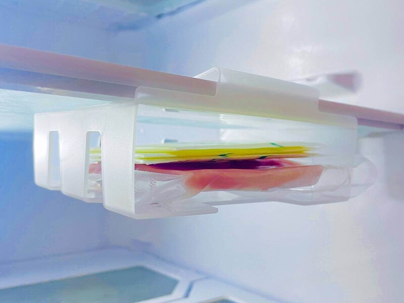 サイズは12.5cm × 5cm × 10.4cmで、棚板の奥行26mm以下・厚み13mm以下のスペースに取り付け可能。挿し込み型ストッパーでしっかり固定され、扉の開閉や振動にも落下せず安心。スライスチーズや薄切りハムなどの食品が「すっぽりハマって、むちゃくちゃスッキリ収納」でき、中身が一目瞭然に整理され、探す手間が大幅に軽減されます。冷蔵庫収納の悩みにプチプラで応える、ストレスフリーな神グッズです。