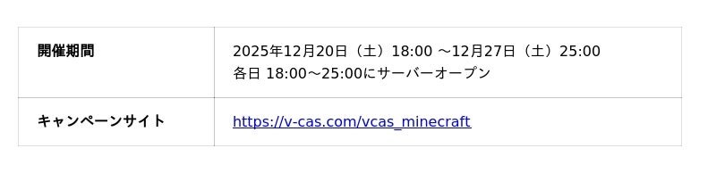 株式会社アイブレイド(本社:東京都豊島区 代表取締役:妻木 泰夫)が運営するVTuberキャスティングサービス「ぶいきゃす」(https://v-cas.com/)は、GMOペパボ株式会社が運営する『ロリポップ!for Gamers byGMOペパボ』の魅力を届ける特別企画として、総勢35名のVTuberが複数のMODが導入されたマインクラフトの世界でサバイバル生活を行うイベントを、2025年12月20日(土)18:00 ~ 12月27日(土)25:00の期間で開催することをお知らせいたします。