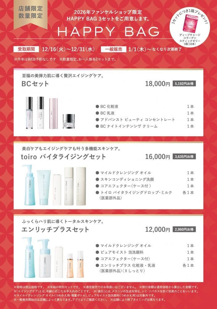 ファンケルは、2025年12月16日から、通信販売と直営店舗で福袋キャンペーンを開始しています。