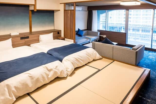 今回アサインされた客室は、鬼怒川渓谷に面した「スーペリア和ベッドツイン」で、小上がりの畳スペースにシモンズのマットレスが敷かれます。小さな子供連れの家族旅行が利用しやすく、年配の人でも起き上がりやすい高さを確保しています。窓際には大きなソファーベッドが置かれ、4名まで利用できる客室です。