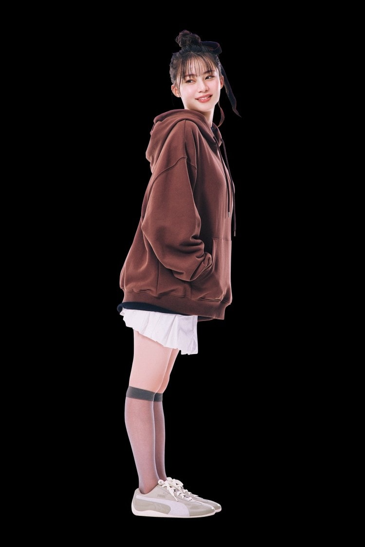 ビッグトップス×ミニできゃしゃ見えを狙って。ブラウンを主役にできる大きめパーカは、カジュアルトップスをメンズライクに見せないミニとリボンで甘さをプラス。