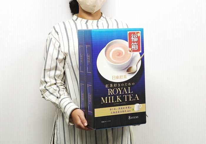 5000円福箱は、ロイヤルミルクティーをテーマにしたセット。実物の約4倍サイズ※1の配送箱でお届けされ、18種類入り7,290円相当※2。価格は税込5,000円です。