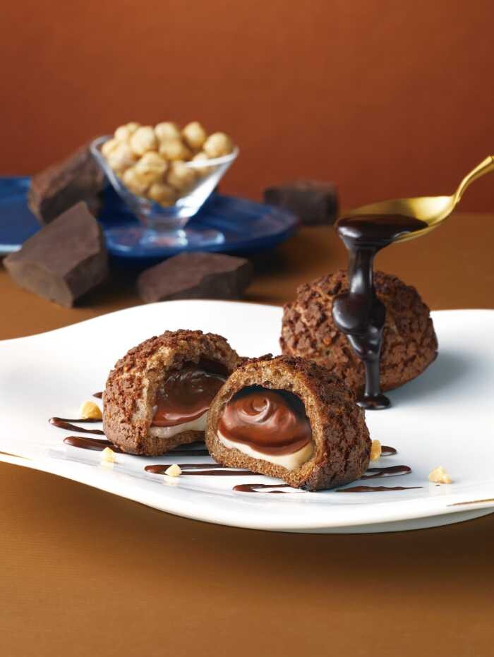 クラッシュナッツトッピングのクッキーシューにジャンドゥーヤとおもち入り。手のひらサイズのデセールで、優しい食感と濃厚な口どけを楽しめます。