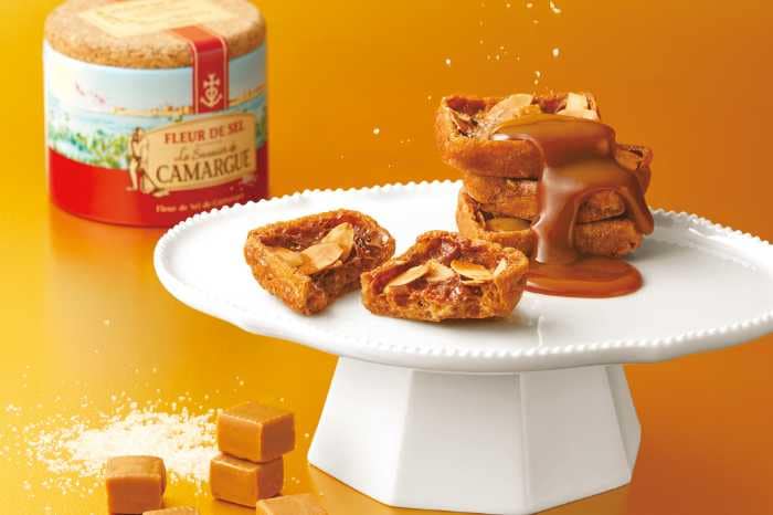 カマルグ産塩使用の塩キャラメルとアーモンドをトッピング。香ばしさと驚きのくちどけが魅力です。