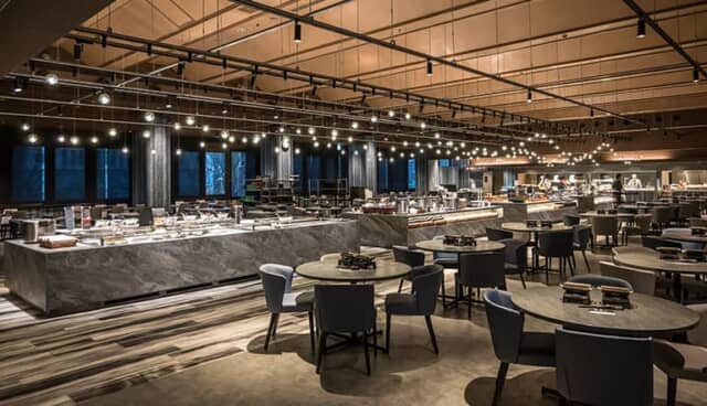 2024年7月にリニューアルしたレストラン「IWATO」はスタイリッシュ。ビュッフェレーンは驚くほど長く、その突き当りにはライブキッチンが並んでいて出来立ての料理を提供。ビュッフェを照らす照明は、ホテルの眼下に流れる鬼怒川渓谷のダイナミックな流れを表現しています。