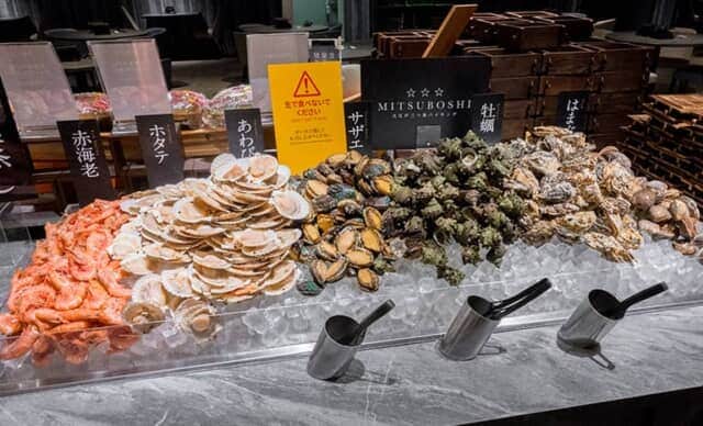 ビュッフェに盛られた「海鮮浜蒸し」のネタは、牡蛎とアワビ、サザエ、ホタテ、赤海老、はまぐりの6品。各テーブルに “せいろ” が用意され、自分で蒸し上げるので熱々を食べられます。