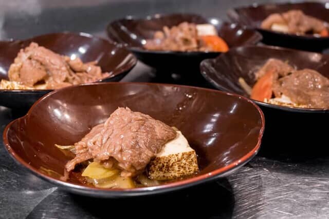 鉄板で肉を焼き、すき焼きのタレで味を付けた「焼きすき」も、ライブキッチンで出来立てを用意します。柔らかな黒毛和牛のロースには揚げだし豆腐とトマトが添えられ、卵黄ソースでいただきます。