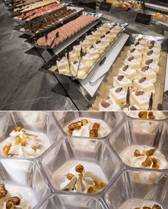 デザートコーナーには、カラフルで多彩な味をそろえた一口サイズのケーキが勢ぞろい。特に冬限定メニューは、北海道産の小豆を使った和風のスイーツ「小豆のババロア」と、林檎の優しい風味が広がる「林檎ゼリー」がありました。