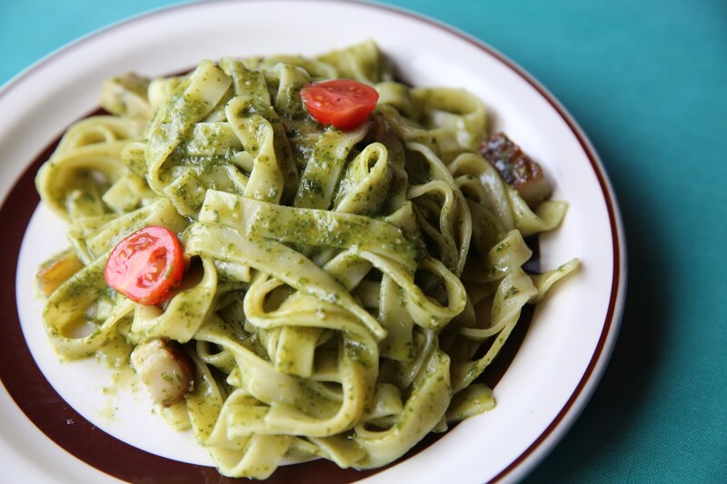 そんなお母さんが腕をふるうおすすめの一品、自家製バジルのジェノベーゼパスタがこちら。バジルは、お母さんが家庭菜園で大切に育てた手作りだ。クラシックなプレートがテーブルにサーブされた途端、バジルの香りが食卓を覆う。ソースがよく絡んだ平打ちのフェットチーネがもちもちして、小麦の香りが食欲をそそる。厚く切った自家製ベーコンはジューシーで、燻製の香りがバジルの爽やかさと相まって絶品だ。