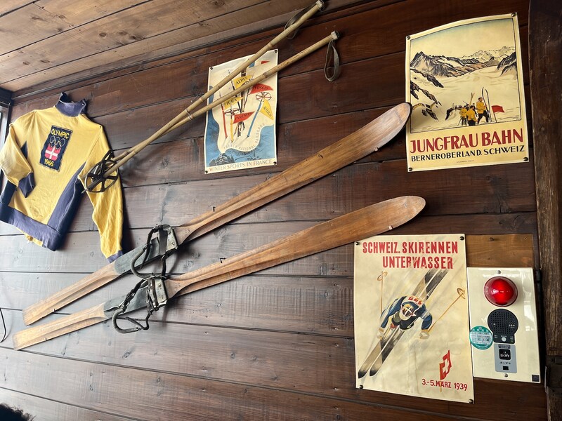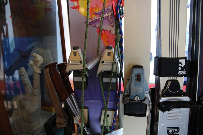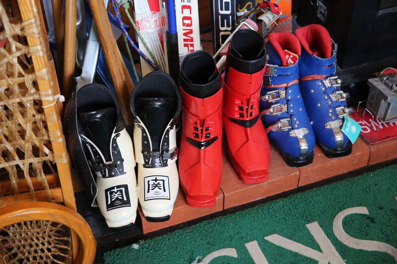 「古いスキーを見るとお客さんが喜ぶんですよ。だから、実家に帰ったときに親父の使っていたスキーを持ってきたりして、飾っているんです。あの赤いラングは、うちの女房の靴ですね」