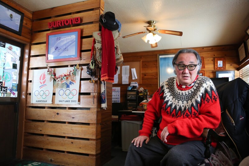 事務所に入ると、白人の男性が足を止め、「これ、私の家にもあるよ」と嬉しそうに指さしている。事務所の壁には、古いスキーの道具が飾られていた。