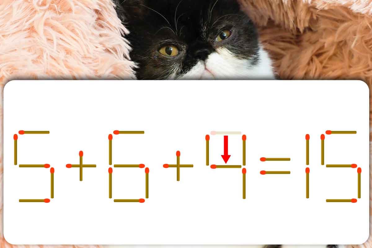 左から試していくと、「5」は「3」に減らせますがこれでは足りません。続いて「6」。変化できるのは「0」「5」「8」「9」といろいろありますが、どれも違いますね。では「7」はいかがでしょうか。ここで上にある横向きのマッチ棒に注目してください。これを垂直に、上から中央へスライドさせましょう。いかがでしょう。いつの間にか数字が「4」になっていませんか?結果、式が「5+6+4=15」になっており、見事に一致しました♪