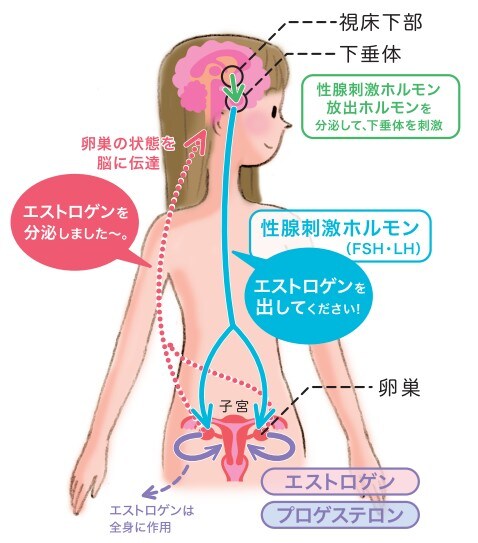 女性ホルモンの代表的なエストロゲンとプロゲステロン(黄体ホルモン)は卵巣から分泌されますが、そのコントロールは脳の視床下部と下垂体が担っています。