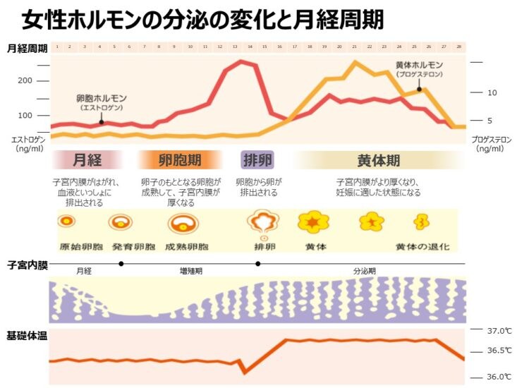 月経周期や子宮内膜の厚みの変化、そしてそれにともなう症状は、次の図で表されています。