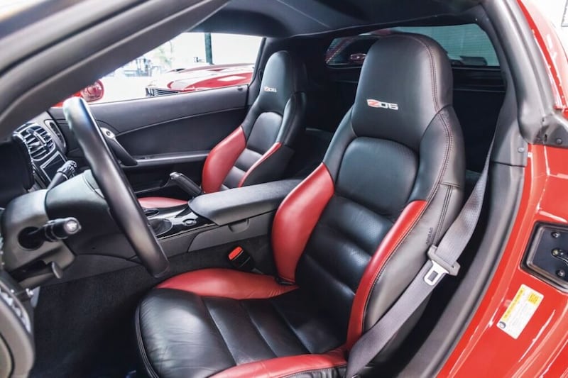ブラックに赤いアクセント&赤いステッチの入るシートはZ06の専用装備でヘッドレストにZ06の文字が入る。