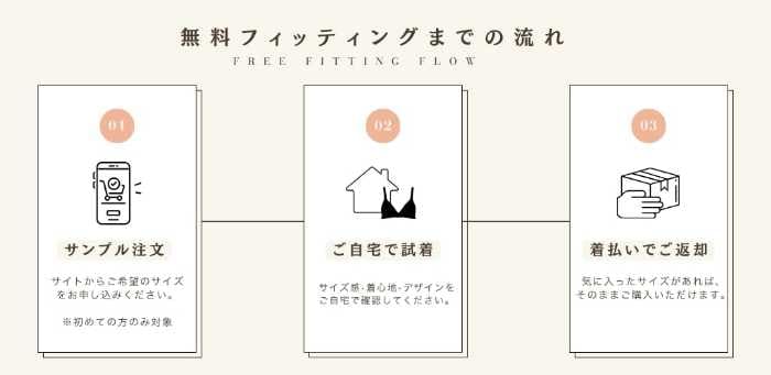 こうした悩みに応える形で、AndBraは初回限定の『セルフフィッティングサービス』を開始。S/M、M/L、L/LLの中から2サイズを自宅で無料試着でき、送料・返送料も不要、購入義務もありません。