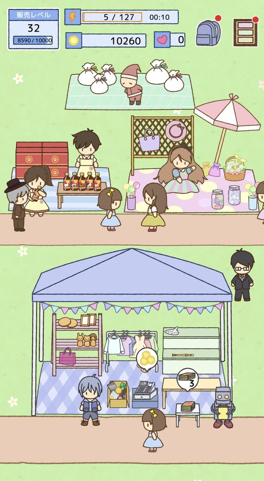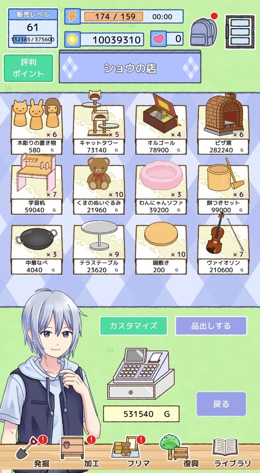 製作できるアイテムは多彩で、作ったアイテムはフリマで販売し、お店を大きくすることができます。