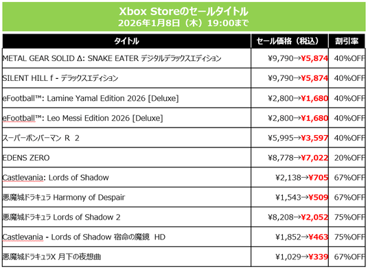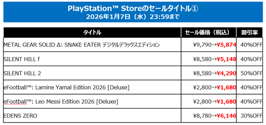 今年発売した『SILENT HILL f』、『METAL GEAR SOLID Δ: SNAKE EATER』、『ときめきメモリアル~forever with you~ エモーショナル』がそれぞれ40%オフと大変お求めやすくなっています。