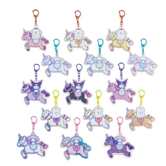 うまをモチーフにした、メリーゴーラウンドデザインのマイメロディ、クロミ、シナモロール、はなまるおばけ、ポムポムプリンのアクリルチャーム。