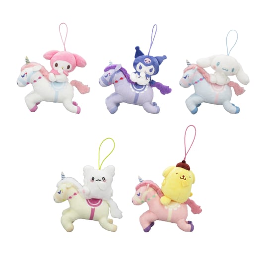 うまをモチーフにした、メリーゴーラウンドデザインのマイメロディ、クロミ、シナモロール、はなまるおばけ、ポムポムプリンのかわいいペアぬいぐるみ。