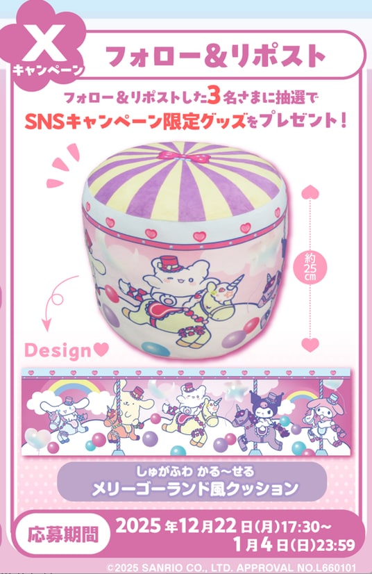 限定プライズ用景品の展開を記念し、モーリーファンタジー公式Xでは、「しゅがふわ かる~せる メリーゴーランド風クッション」が抽選で3名さまに当たるSNSキャンペーンを開催いたします。