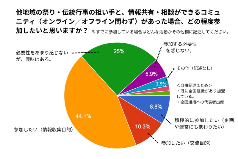 また、祭り・イベント関係者同士のコミュニティがあれば参加したいか、という問いには、前向きな意見が多く寄せられました。他地域の事例を知りたい、課題や悩みを共有したいといった声からは、個々の現場が孤立しがちな状況が背景にあることがうかがえます。