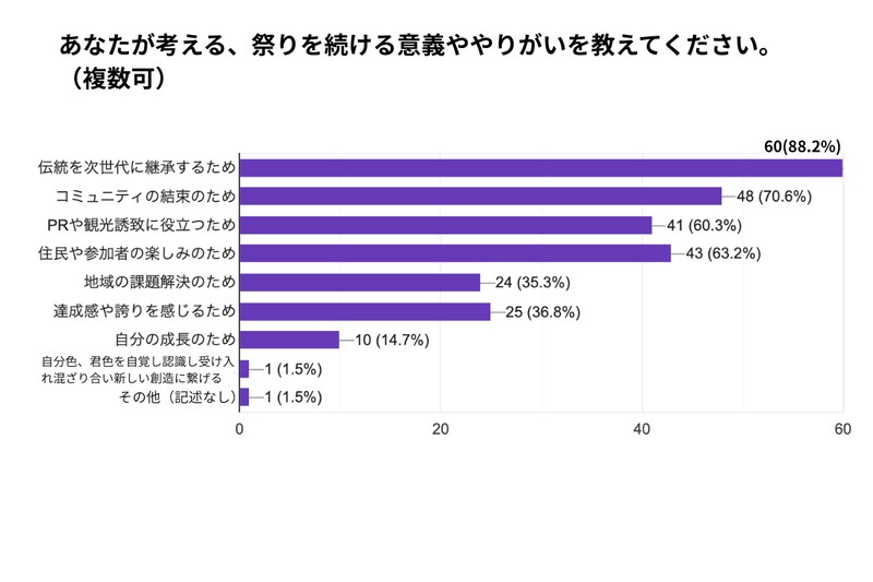 本アンケートでは、祭りや地域イベントを続ける意義についても意見を寄せていただきました。そこに共通していたのは、祭りが単なる催しや観光資源ではなく、人と人、人と地域をつなぐ営みとして捉えられているという点です。「伝統を次世代に継承するため」「コミュニティの結束」「住民や参加者のため」「地域に帰属意識や誇りをもたらすこと」といった代替しがたい価値が祭りにあるという回答が多く見られます。