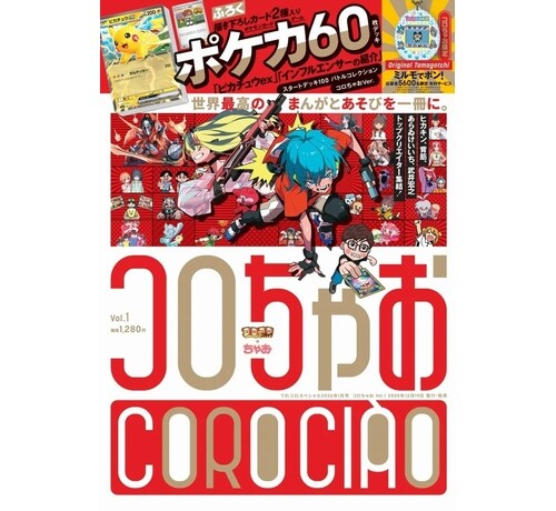 新雑誌「コロちゃお」には、25ものまんが作品が掲載されるほか、描き下ろしカード2種(「ピカチュウex」「インフルエンサーの紹介」)入りの「ポケモンカードゲーム」デッキと、漫画「ミルモでポン!」(篠塚ひろむ)とコラボした限定デザインの「Original Tamagotchi(オリジナルたまごっち)」(※抽選で5,600名対象の応募者限定有料サービス)の豪華2大特典付き。