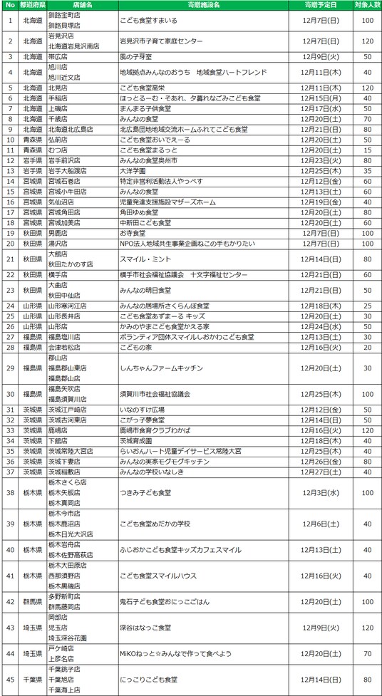 このたびの活動は、社会貢献活動の一環として、店舗周辺の子ども食堂や福祉施設へクリスマスのお菓子を寄贈するものです。寄贈時には、当社従業員が施設を訪問し、施設スタッフ様と協業でクリスマス会等のイベントを開催いたしました。また、寄贈品については、「令和6年能登半島地震」ならびに「令和7年8月熊本豪雨災害」により甚大な被害を受けた石川県、熊本県の菓子製造会社から購入することで、復興支援につなげるとともに、被災地の現状を伝え、支援の輪を風化させることなく全国へ広げていきたいと考えております。