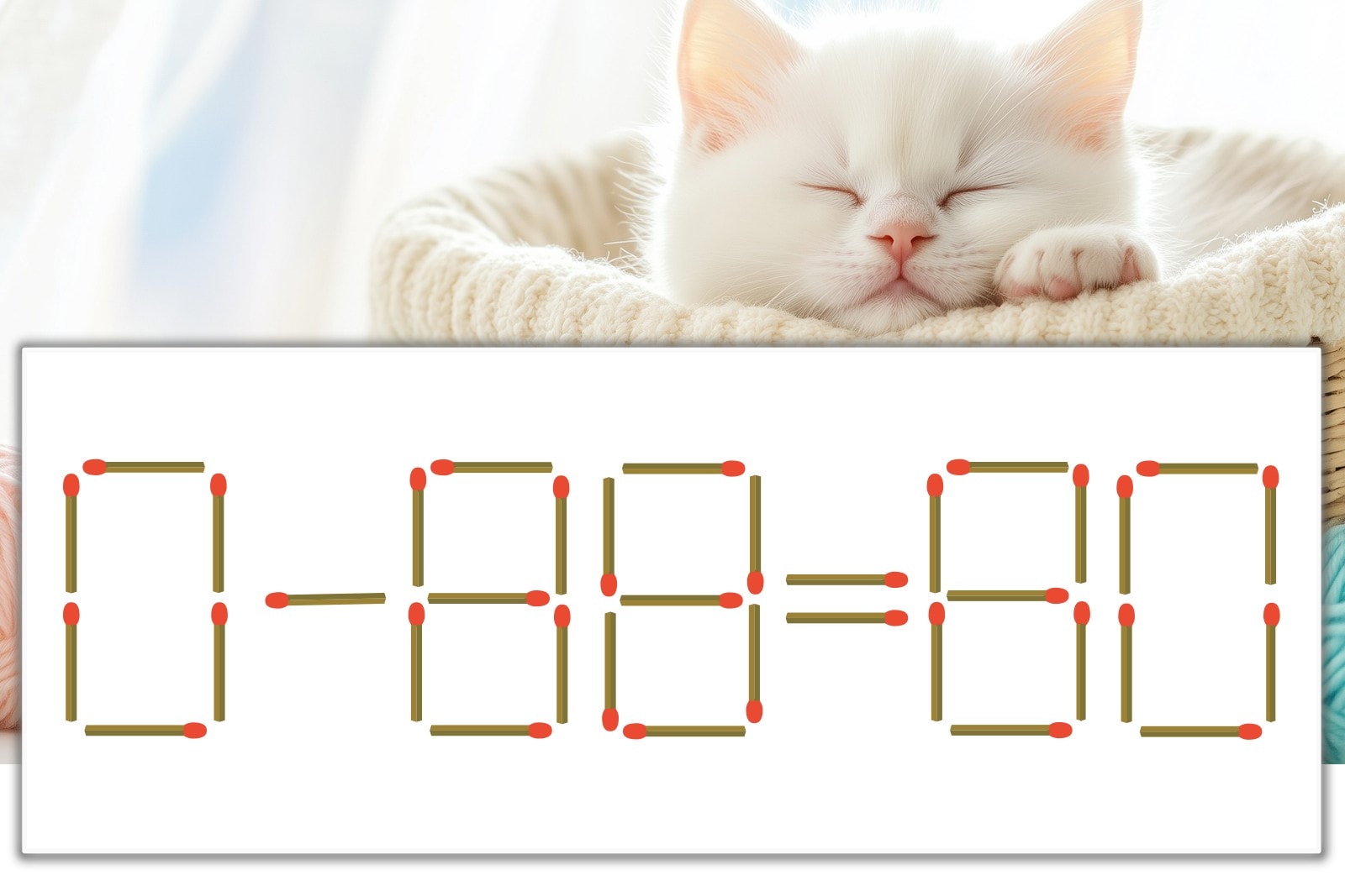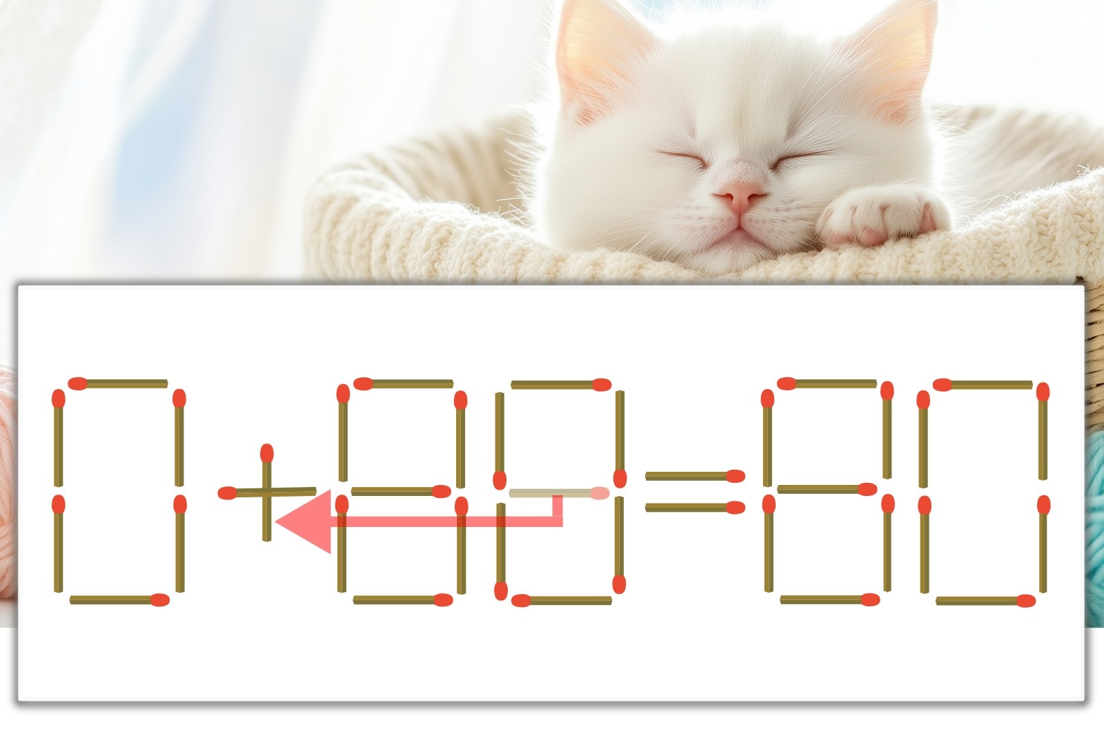 「8」を別の数字に変化させると答えが導き出せます。一の位の「8」のマッチ棒を1本移動して、「-」を「+」にしてみましょう。すると、「0+80=80」が成立します。